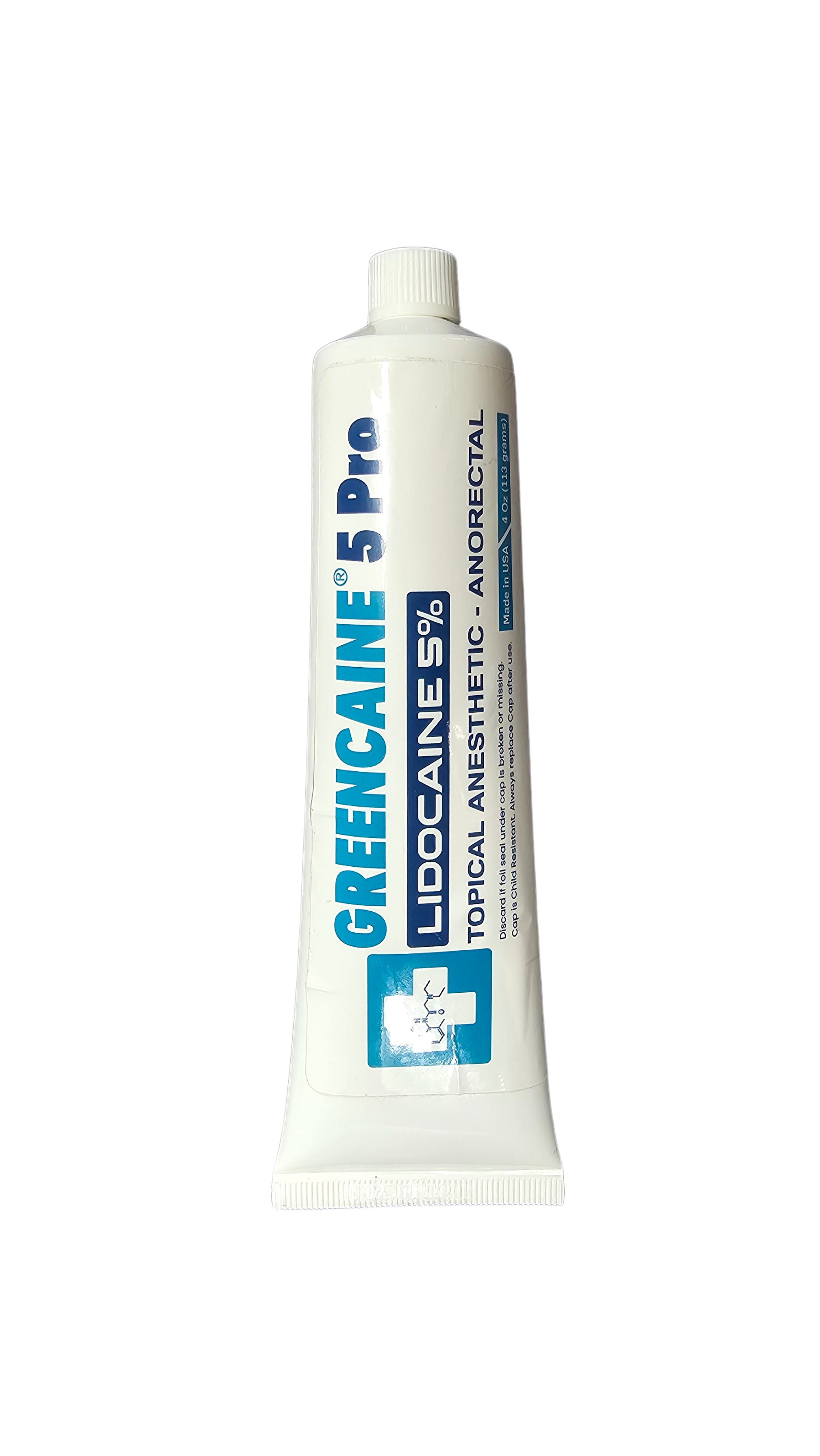 Greencaine 5 Pro is a Numbing Cream with Lidocaine 5%, in a 4 Oz tube for the temporary relief of pain and itching associated with minor skin irritations, minor cuts, minor burns, scrapes or insect bites.